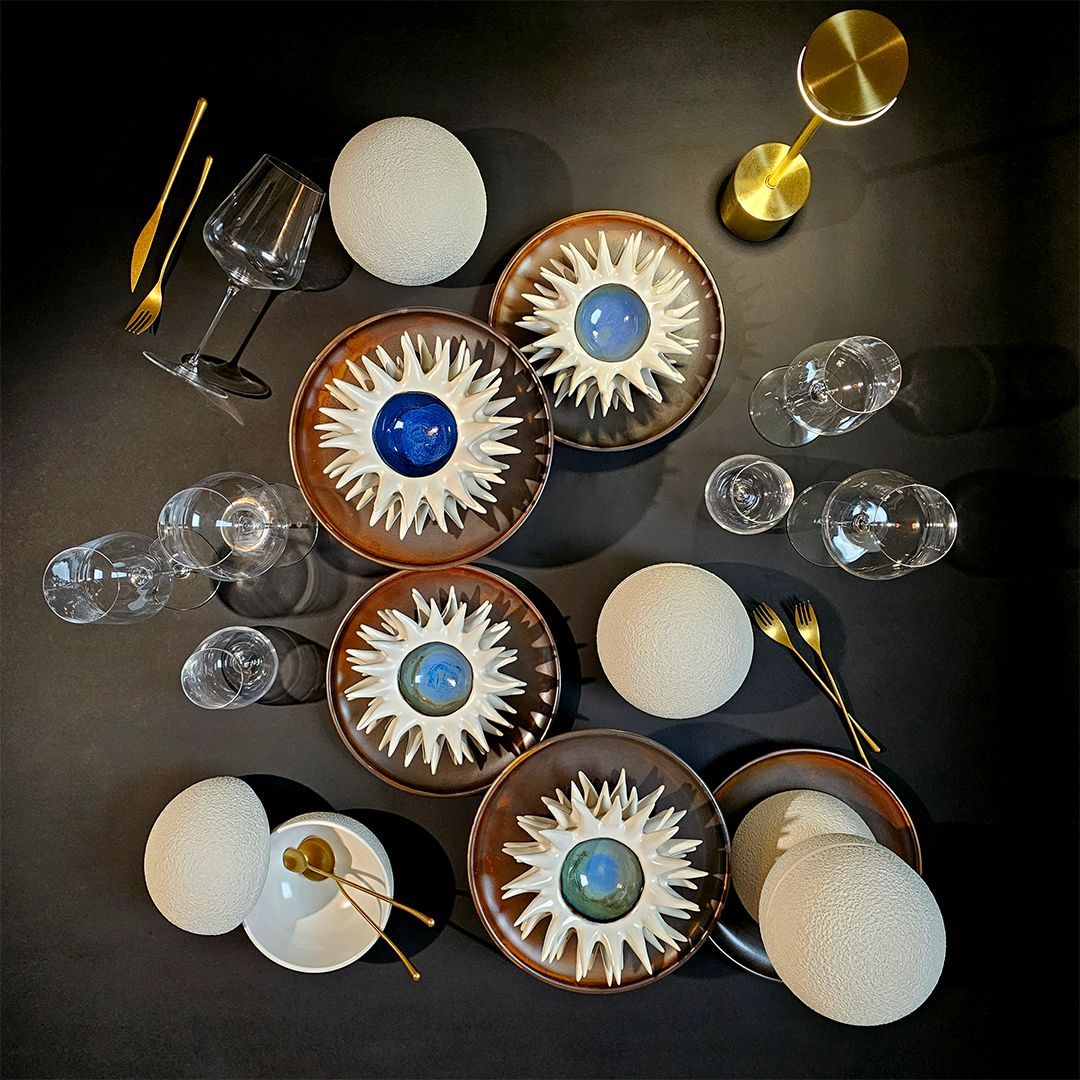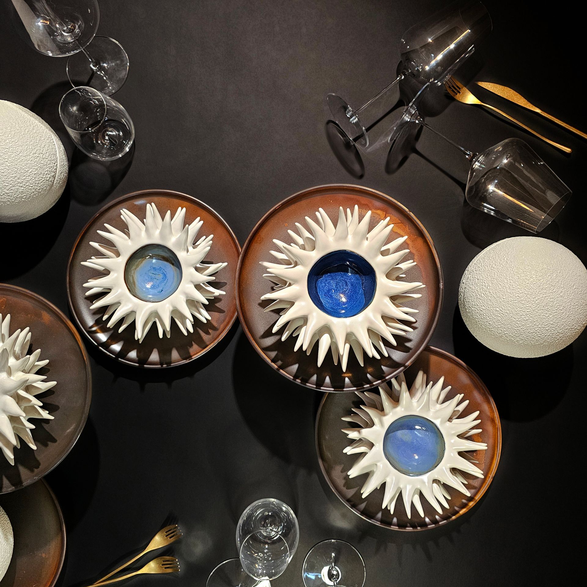 Stylish 6-persons AKARI Dinner Set of 60 items . Handmade and truly a statement. Surprise your guests at the table with a beautiful presentation dish. These unique design plate created by inspiration of shape of a sea urchin. Enjoy a hot meal in the round bowl with lid and create a moment of experience. With these exclusive designs, you elevate every experience and every dish to the highest level. The AKARI Dinner Set includes golden cutlery and elegant wine glass, made of high-quality crystal. Created with unique signatures, The AKARI Set embodies originality but simplicity, making it a stunning addition to any table setting.Perfect for those who appreciate the remarkable things in life.