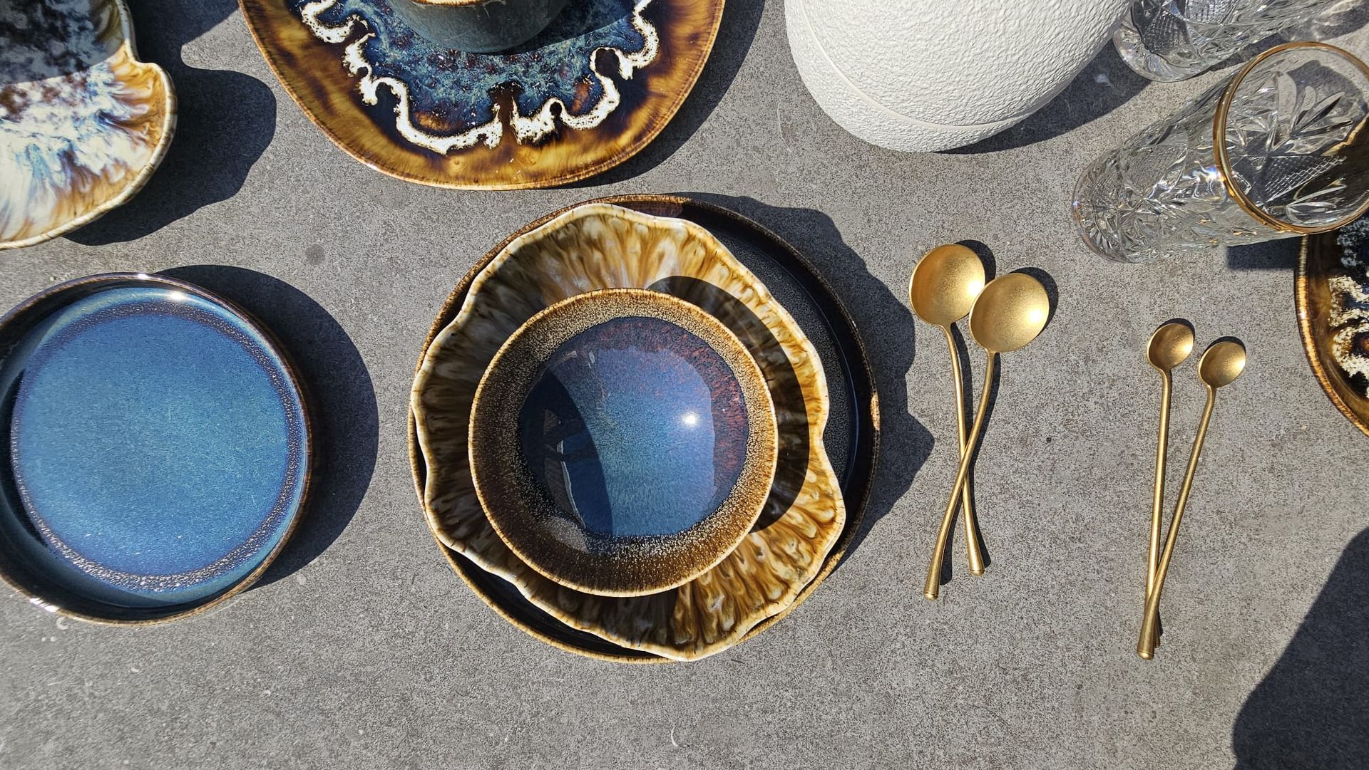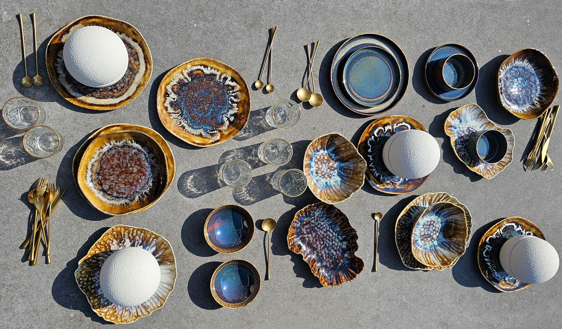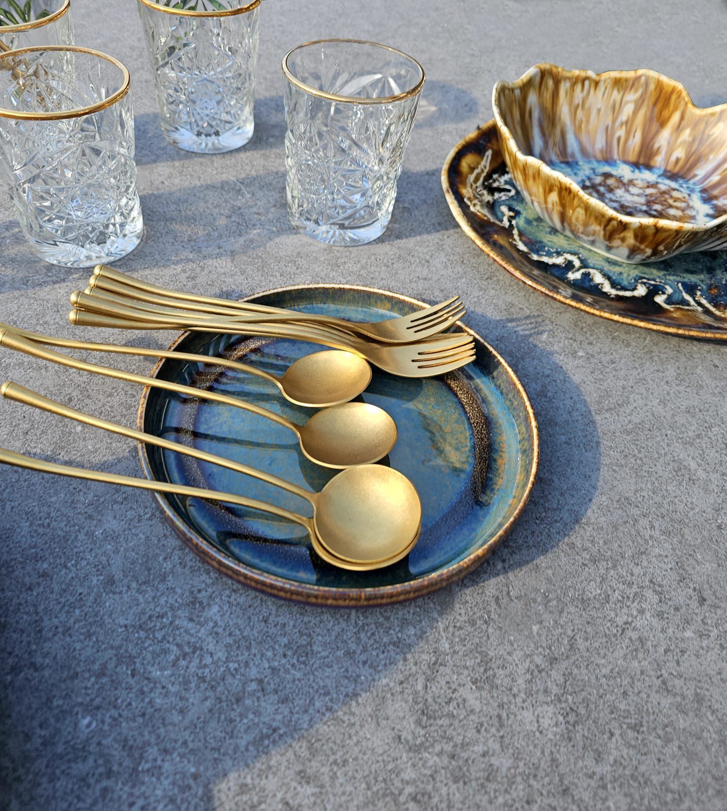 Crafted with unique signatures, 6-persons The PEARL Dinner Set of 56 items embodies luxury and harmony, making it a stunning addition to any table setting. The set has very original natural shapes, inspired by the marine environment and characterised by refinement, exclusivity and originality to give your table a unique and natural touch. The PEARL Set includes golden rustic cutlery and stunning 6 glasses with elegant gold touch.